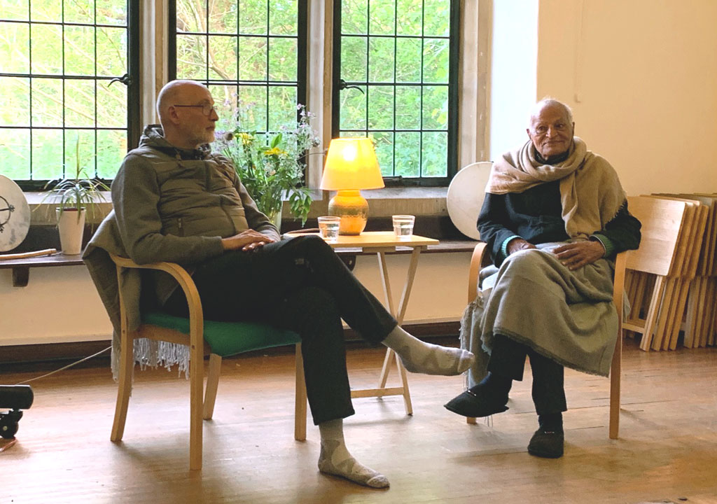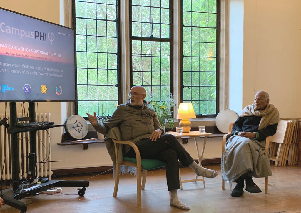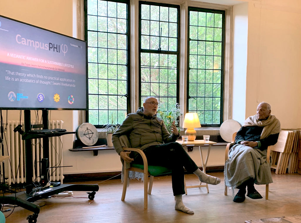 Satish Kumar introdujo a Swami Rameshwarananda a los asistentes y afirmó que “CampusPHI era un ejemplo práctico de ecología reverencial y de economía sostenible, solidaria y duradera”, afirmó que, disfrutó de la visita que él mismo realizó a CampusPHI, “un lugar en el que es posible llevar una vida sencilla”.