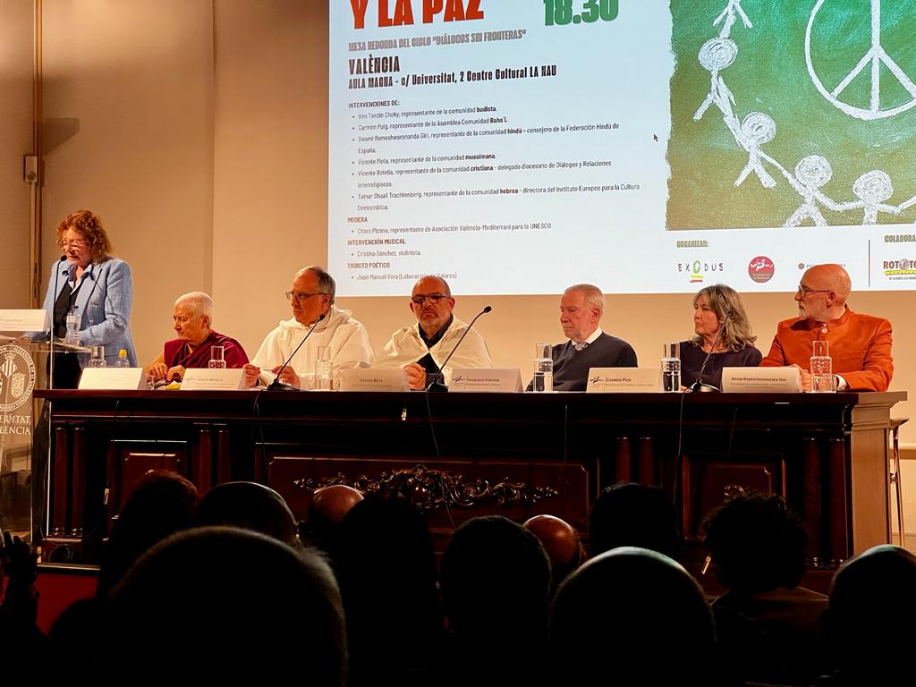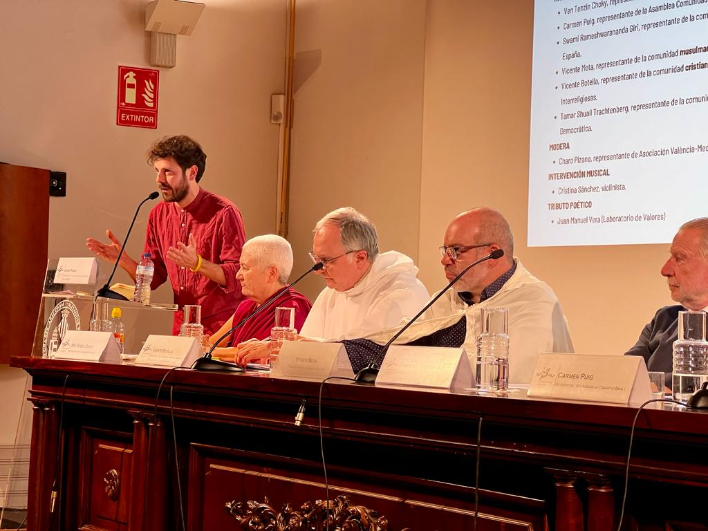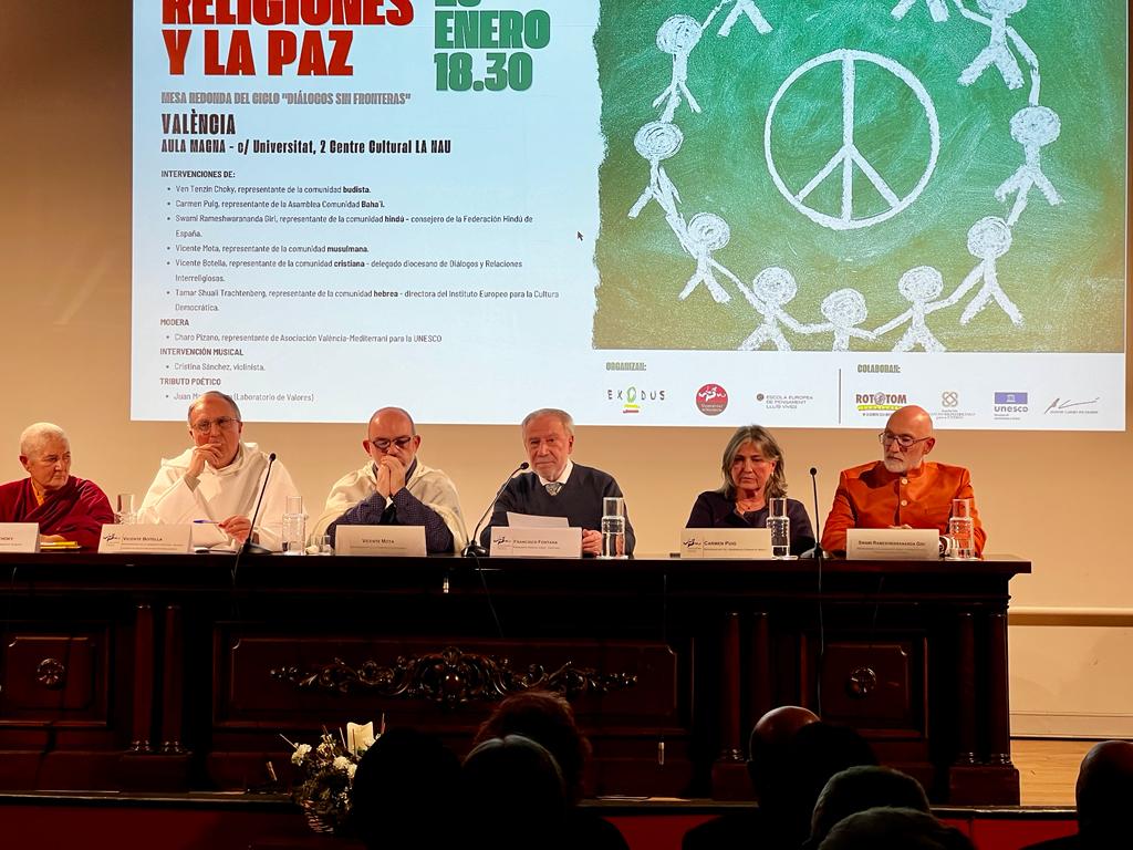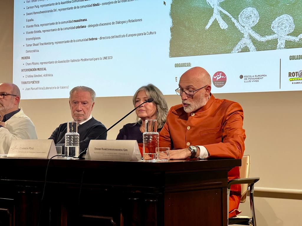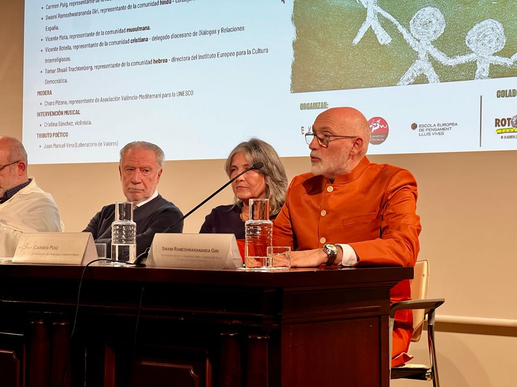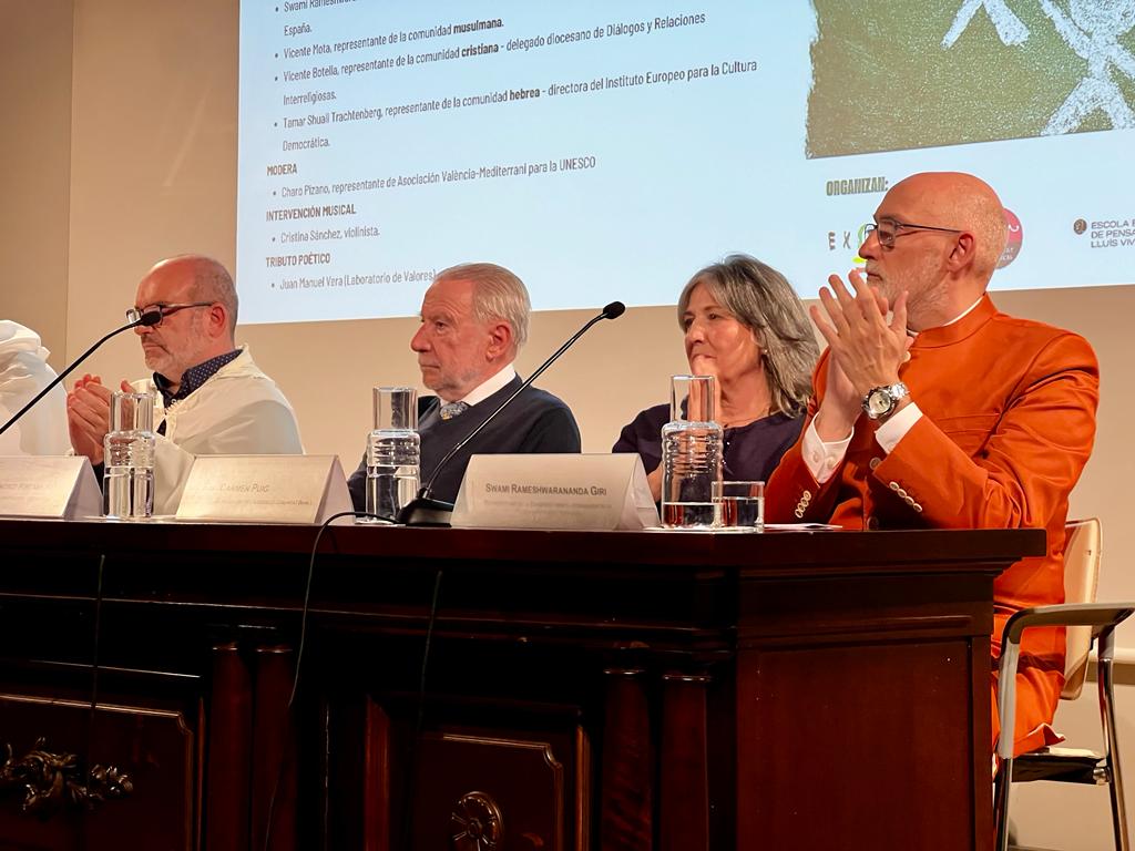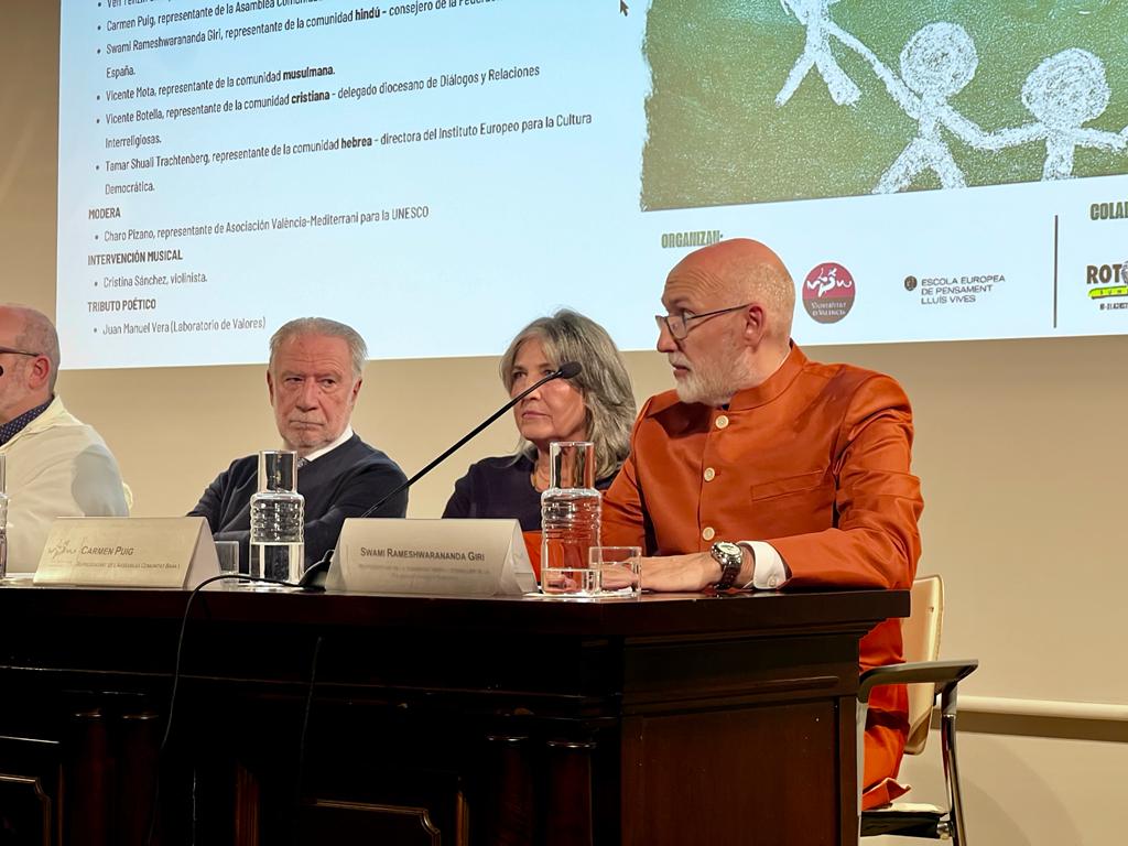 Además de Swami Rameshwarananda, Presidente de Fundación PHI y del Foro Interreligioso Internacional Transcendence, en representación del hinduismo, participaron Vicente Botella, representante de la comunidad cristiana y delegado diocesano de Diálogos y Relaciones Interreligiosas; Mansur Vicente Mota, imán de Valencia, como voz de la comunidad musulmana, Francisco Fontana, presidente de la asociación Amistad Judeo-Cristiana; Venerable Tenzin Choky de la comunidad budista y Carmen Puig, en representación de la Asamblea Comunidad Baha’i. Como moderadora, Charo Pizano, de la Asociación València-Mediterrani para la UNESCO introdujo a cada una de las confesiones.