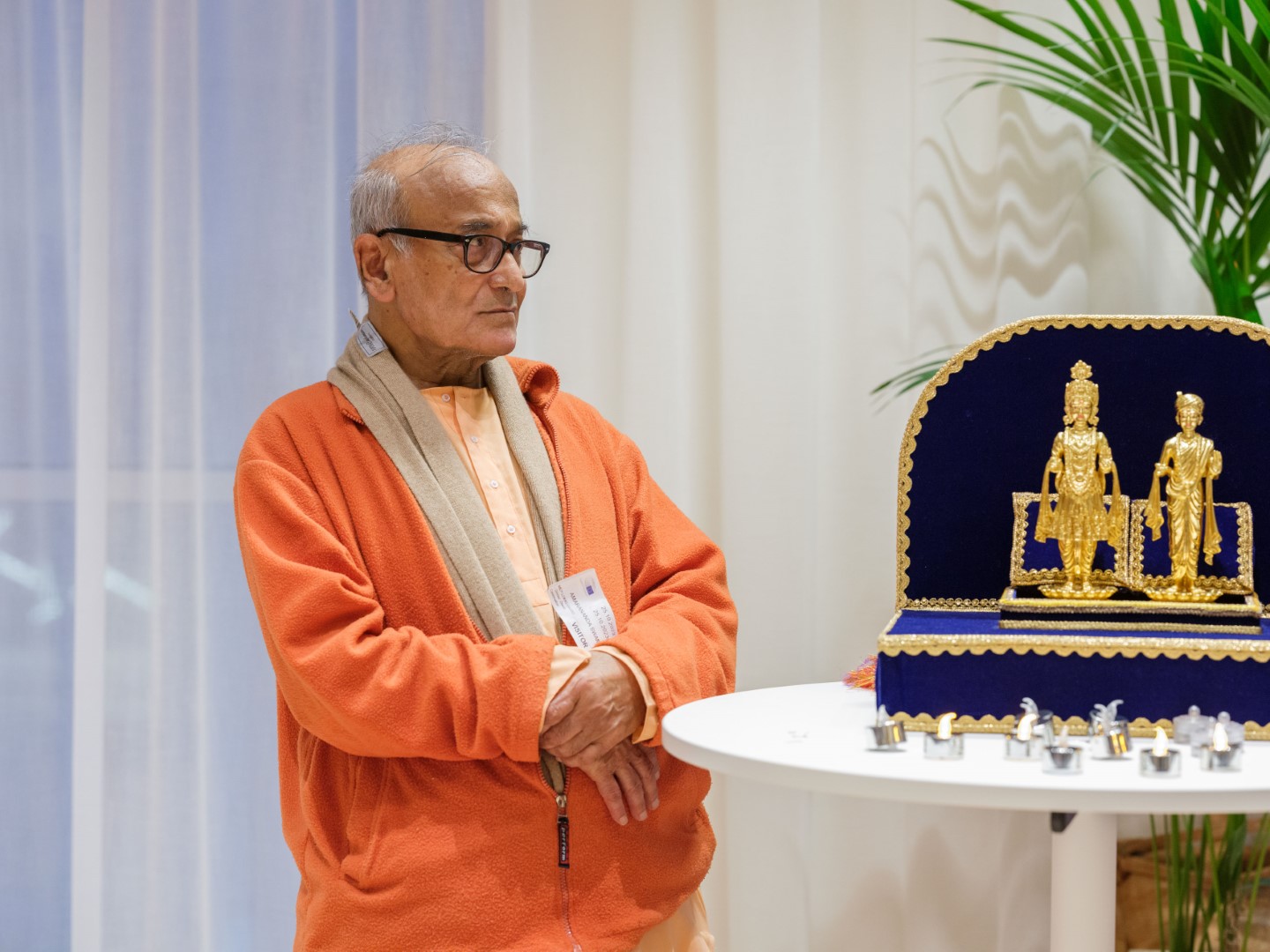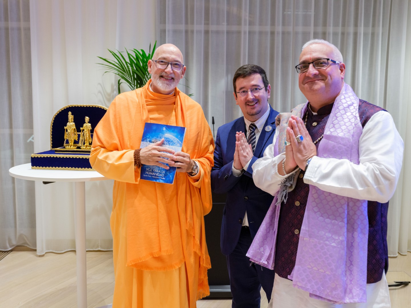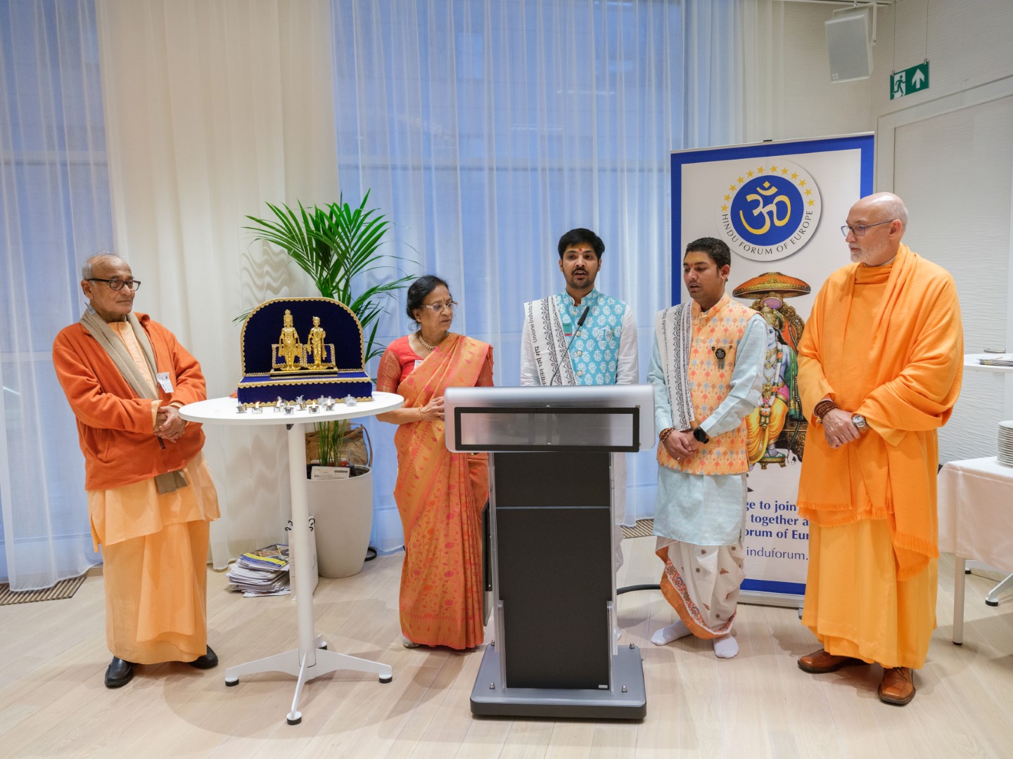 El programa comenzó con un mensaje de bienvenida de la Dra. Lakshmi Vyas, presidenta del HFE. A continuación, Pandit Krishna Kripa Das, Juan Carlos Ramachandani, vicepresidente de la Federación Hindú de España (FHE) entonó oraciones en sánscrito invocando la gracia de los maestros y la consecución de la paz.