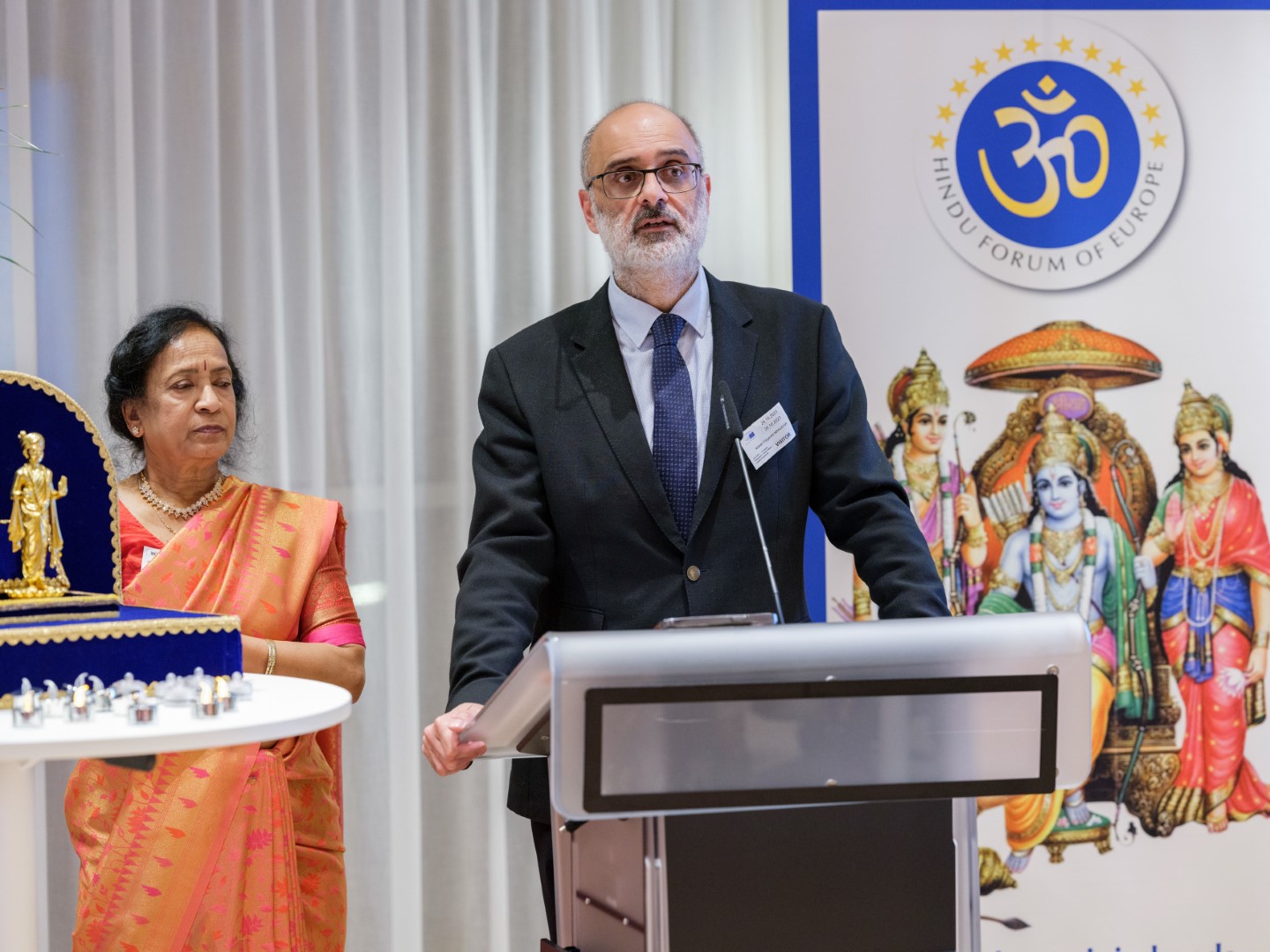 La representación institucional estuvo a cargo del anfitrión del evento Lokkegard Morten, Miembro del Parlamento Europeo y presidente de la Delegación de la UE en la India. También asistió la europarlamentaria Maxette Pirbakas, francesa de origen indio y delegada de relaciones institucionales con la India, cuyo discurso llamó a la protección y celebración de las tradiciones. No faltó la representación diplomática de los dos países con mayor número de hindúes en el mundo, por la India fue su embajador en Benelux su excelencia el Sr. Santosh Jha y por Nepal su excelencia el Sr. Gahendra Rajbandhari, así como un representante de la embajada de Isla Mauricio.