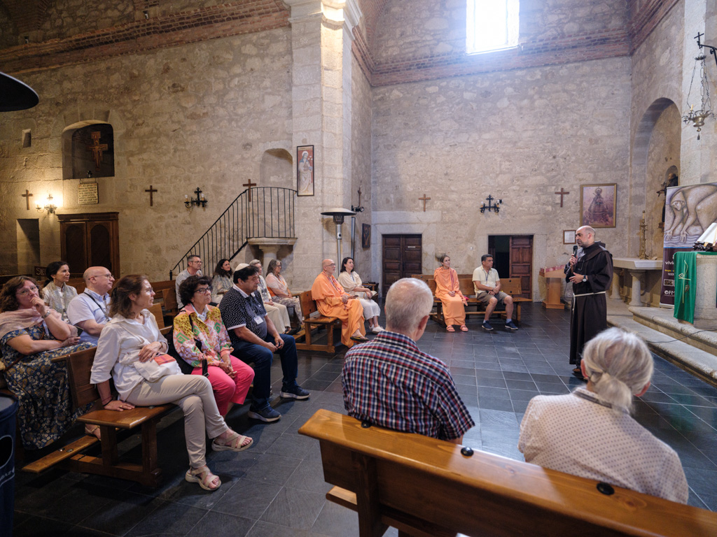 Igualmente hubo tiempo para experiencias en la naturaleza, como un “baño de bosque” en el entorno del Embalse del Prado de las Monjas. Los asistentes participaron de una visita guiada por el Campus PHI, donde se les mostraron los sistemas de depuración de aguas, las diferentes energías renovables que utiliza el complejo y su huerto ecológico. Visitaron también el Centro Vedántico, cuya comunidad monástica pudo compartir, en su sala de meditación, los momentos de silencio y recogimiento con los representantes del FIIT. El último día visitaron el convento franciscano de El Palancar (Pedroso de Acim, Cáceres), fundado por San Pedro de Alcántara, donde el Foro fue fraternalmente recibido por los monjes franciscanos, quienes amablemente guiaron la visita del grupo y se realizó una oración interreligiosa conjunta.