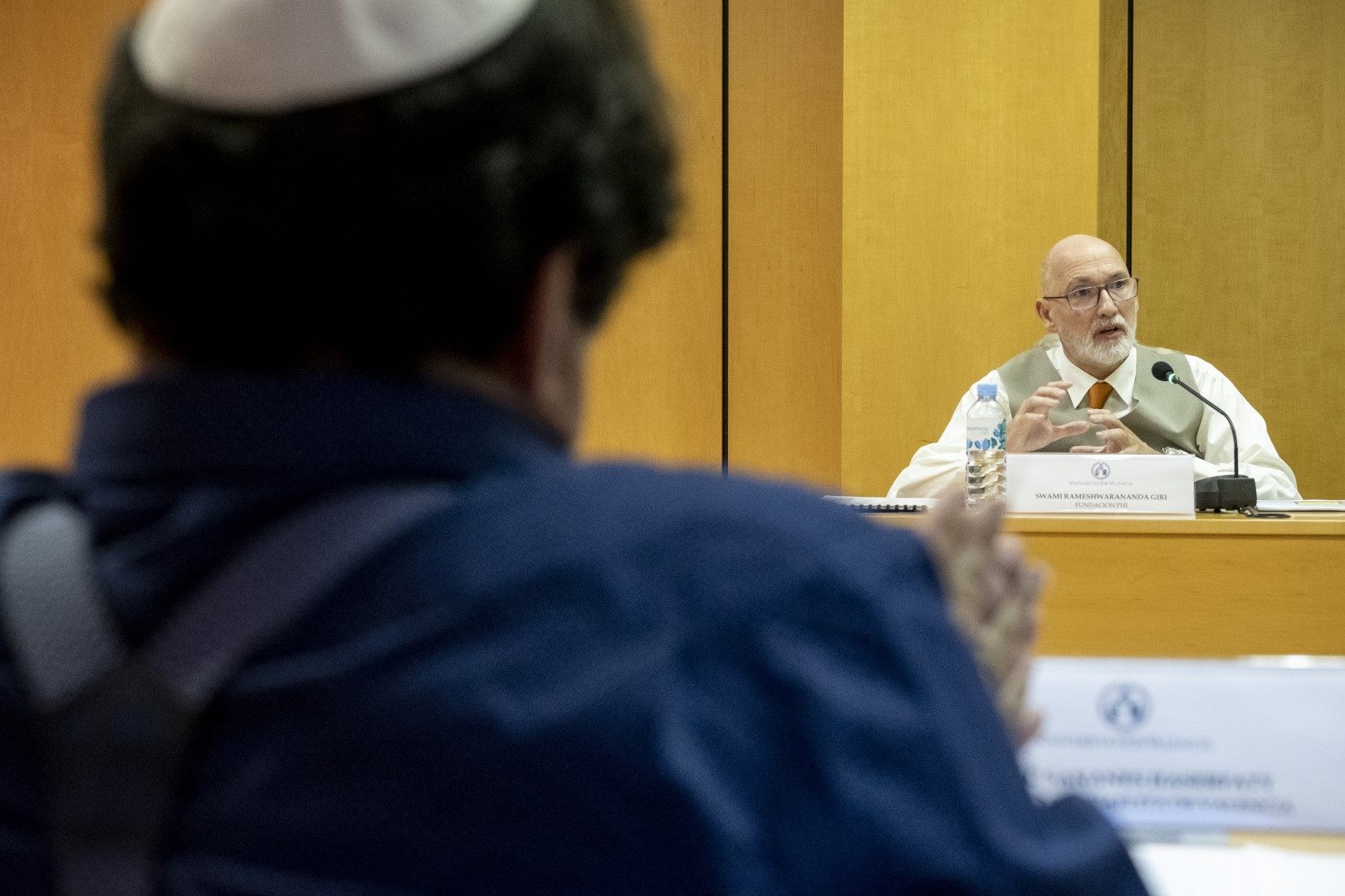 El pasado 17 de noviembre de 2023, H.E. Pujya Swami Rameshwarananda Giri Maharaj, participó en unos encuentros para fomentar el diálogo entre las diferentes religiones, organizado por la Universitat de València.